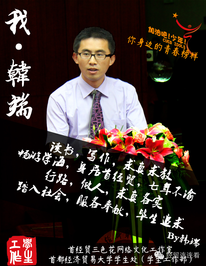 加油吧!少年!-韩瑞(第一季)本科就读于经济学院经济学(实验班)的韩端,在以优异成绩保送本校继续攻读数量经济学硕士学位期间,成为了研究生中的楷模。科研路上奋达有为,服务路上贡献社会。他的人生精彩之处,点点滴滴,光辉可见。