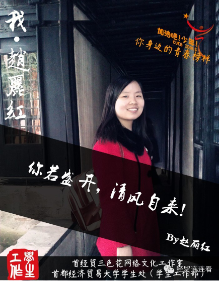 加油吧!少年!-赵丽红(第一季)赵丽红,来自劳动经济学院10级人力资源管理实验班。二百一十万两千四百分钟,她的大学生活在青春中走过。大学四年,从第一次做志愿者的兴奋快乐,第一次参加实习的激动欣喜,第一次献血的紧张忐忑,第一次为了办某个活动而不眠不休,让她从一个懵懂而稚嫩的小女孩儿,逐步经历了学业、工作、实践、生活等各方面的锻炼,挥洒出了青春的盎然与活力。无数的新尝试,每一分钟的全新改变,最终磨练出了今天的她。